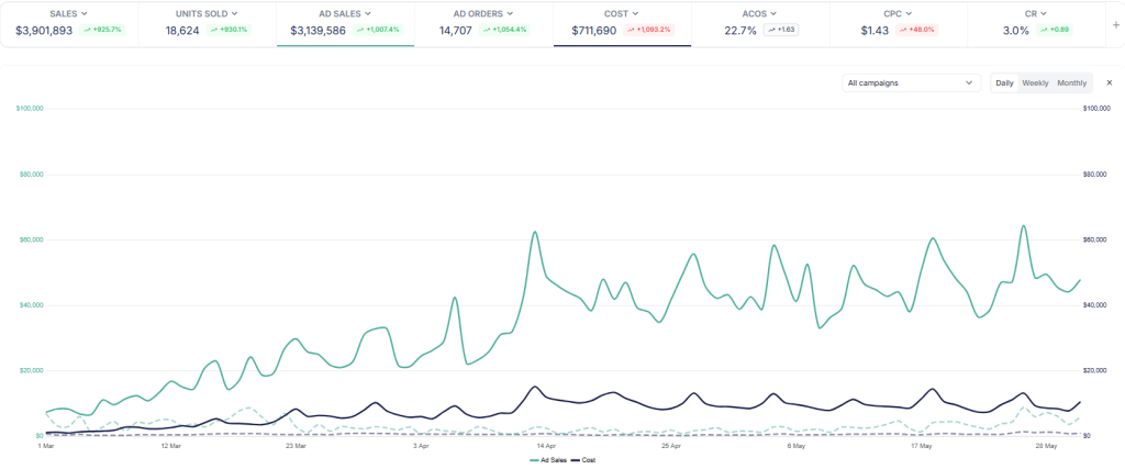 Efficiency Gains: Scaled ad sales while maintaining a stable ACOS.