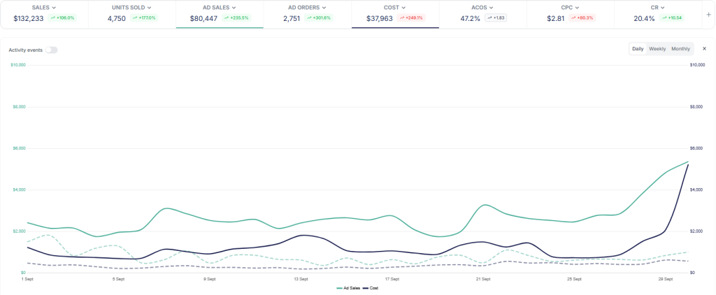 The trend reversed almost immediately. By balancing the account, we triggered a “flywheel effect” where both ad sales and organic sales increased simultaneously while keeping ACOS stable.